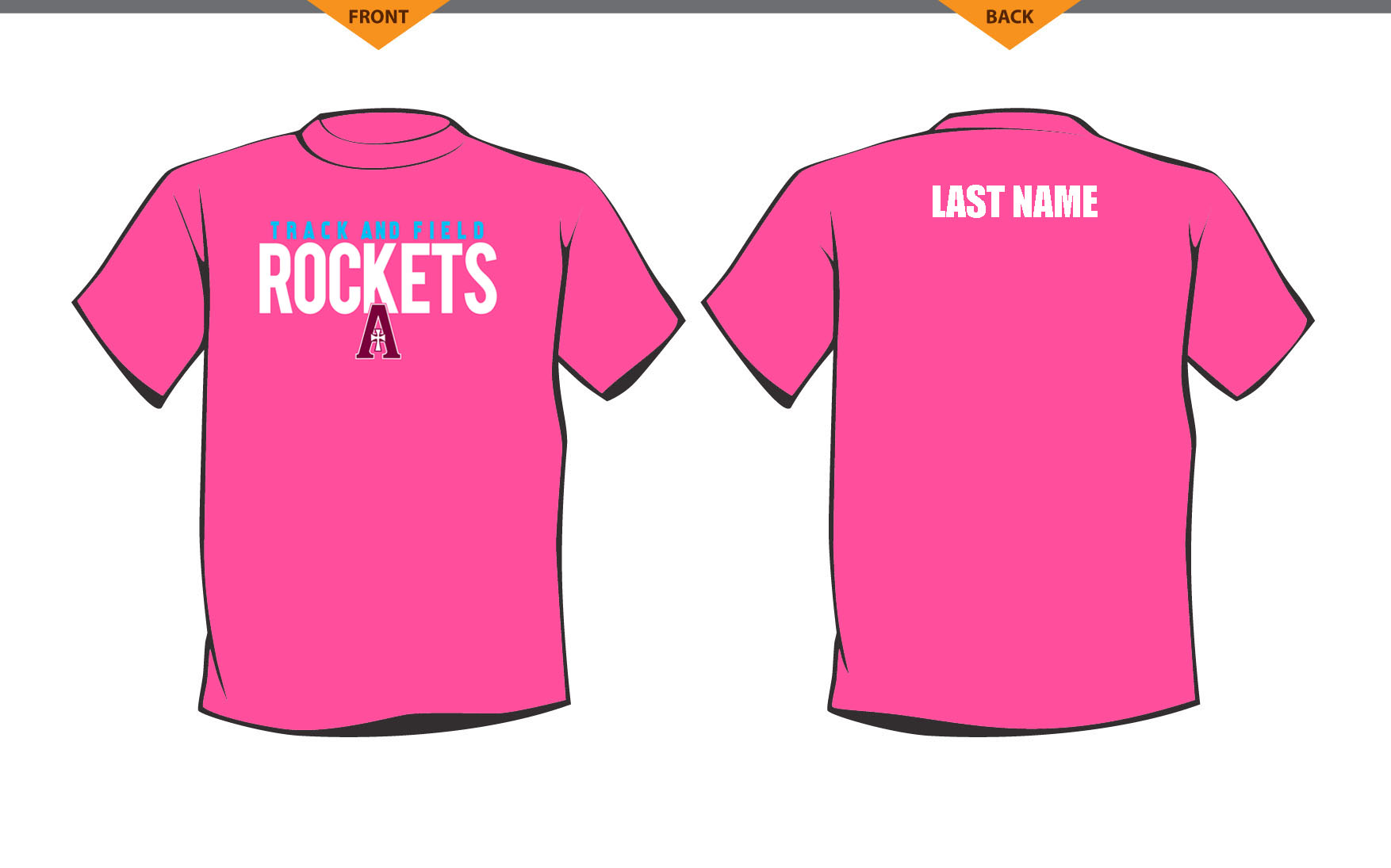 Team shirt: Pink moisture-wicking short sleeve t-shirt with a three color (maroon, white and blue) front design and last name in white on the back.